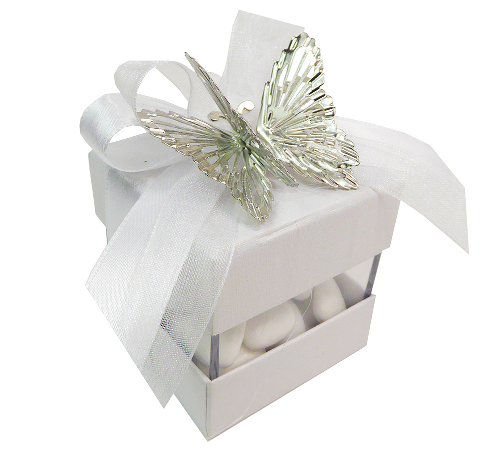 Bomboniera per Matrimonio nozze argento composta da scatolina quadrata mix in cartone oro argento parte centrale in plexy, nastro doppio raso avorio, nastro organza bianco, applicazione in metallo di farfalla in colorazione argento.LA BOMBONIERA VIENE SPEDITA COME IN FOTO, IL COLORE E GUSTO DEI CONFETTI E BIGLIETTO STAMPATO SU VOSTRA INDICAZIONE A ZELDABOMBONIERE@GMAIL.COM. IN MANCANZA DI SPECIFICHE INSERIREMO CONFETTI ALLA MANDORLA IN COLORE BIANCO E BIGLIETTI BIANCHI.