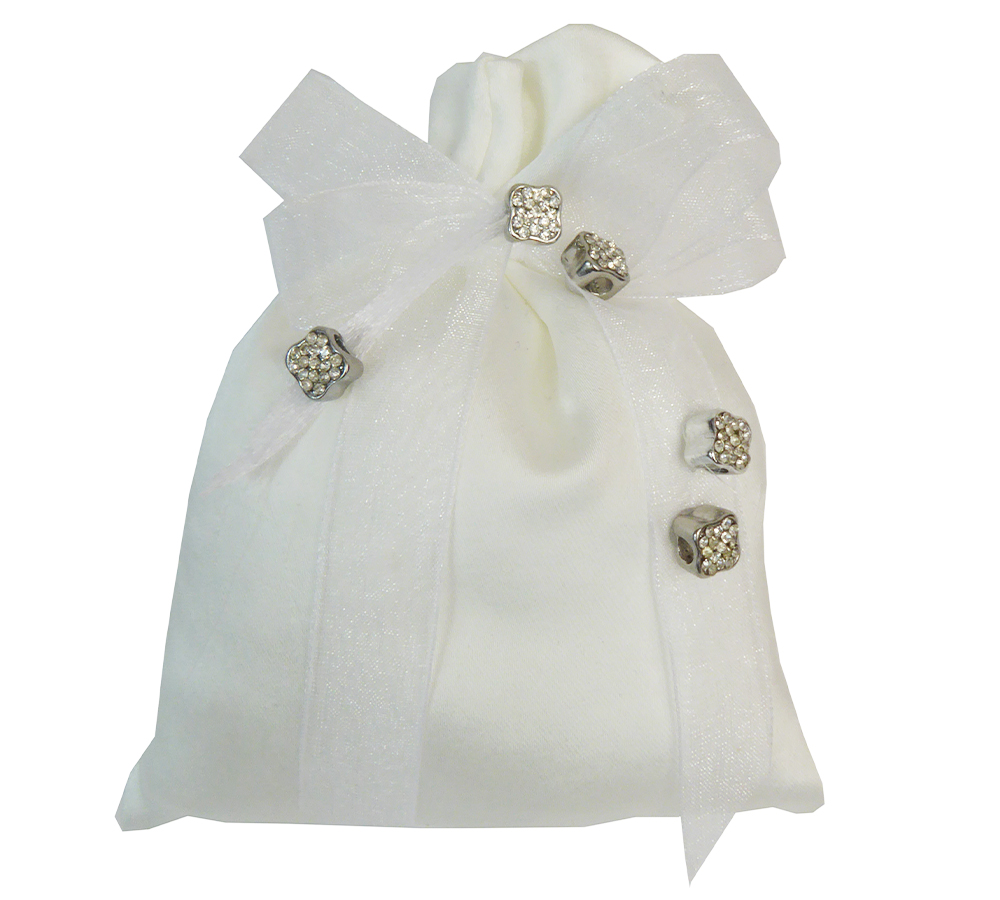 Bomboniera matrimonio o anniversario composta da sacchetto in raso bianco, nastro organza semi-trasparente bianco, nastro raso bianco, strass decorativi lumiosi sparsi. LA BOMBONIERA VIENE SPEDITA COME IN FOTO, IL COLORE E GUSTO DEI CONFETTI E BIGLIETTO STAMPATO SU VOSTRA INDICAZIONE A ZELDABOMBONIERE@GMAIL.COM. IN MANCANZA DI SPECIFICHE INSERIREMO CONFETTI ALLA MANDORLA IN COLORE BIANCO E BIGLIETTI BIANCHI.