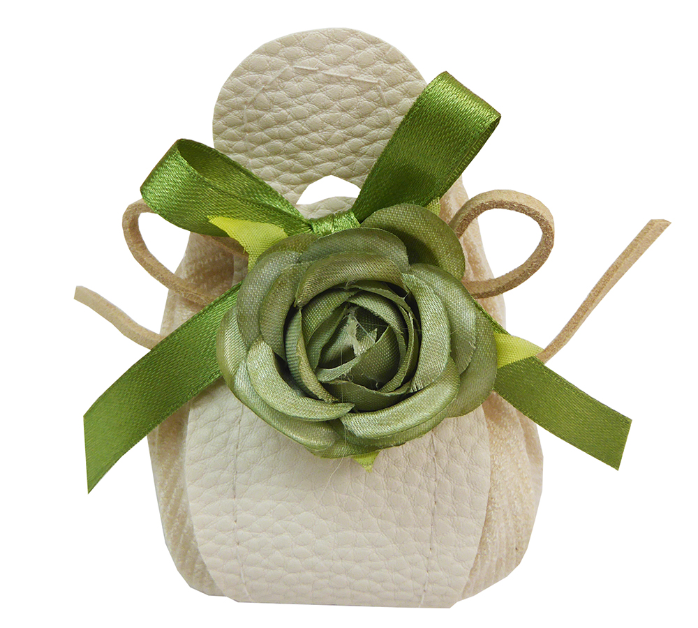 Bomboniera per Matrimonio composta da sacchetto misto in ecopellle e cotone in colorazione bianco con chiusura in colorazione bianca, nastro doppio raso verde, e applicazione fiore aritficiale in tessuto verde. LA BOMBONIERA VIENE SPEDITA COME IN FOTO, IL COLORE E GUSTO DEI CONFETTI E BIGLIETTO STAMPATO SU VOSTRA INDICAZIONE A ZELDABOMBONIERE@GMAIL.COM. IN MANCANZA DI SPECIFICHE INSERIREMO CONFETTI ALLA MANDORLA IN COLORE BIANCO E BIGLIETTI BIANCHI.